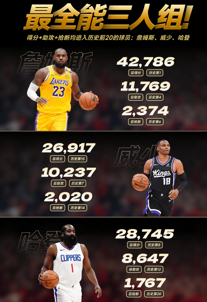 现役也只有三人得分、助攻、抢断进入前20,这三人分别是:詹姆斯、威少、哈登。