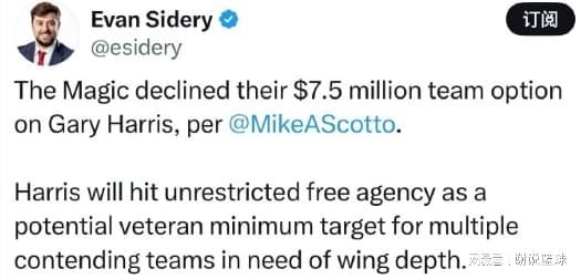 根据记者埃文-西德里报道,东部新贵奥兰多魔术,已经放弃执行四名替补球队选项,包括加里-哈里斯、大瓦格纳、科里-约瑟夫和凯莱布-修斯坦。没想到一向保守的魔术,今年休赛期格外激进,其中加里-哈里斯,可能很适合湖人和勇士这样的豪强,埃文-西德里也补充表明,多支球队正关注这名30岁工兵。